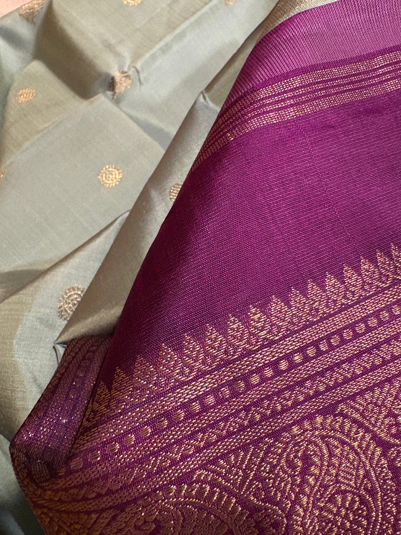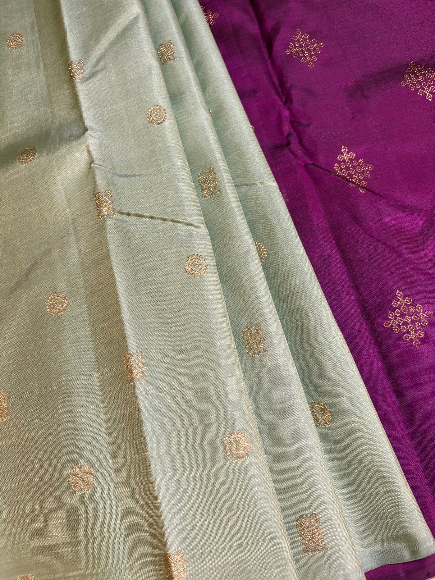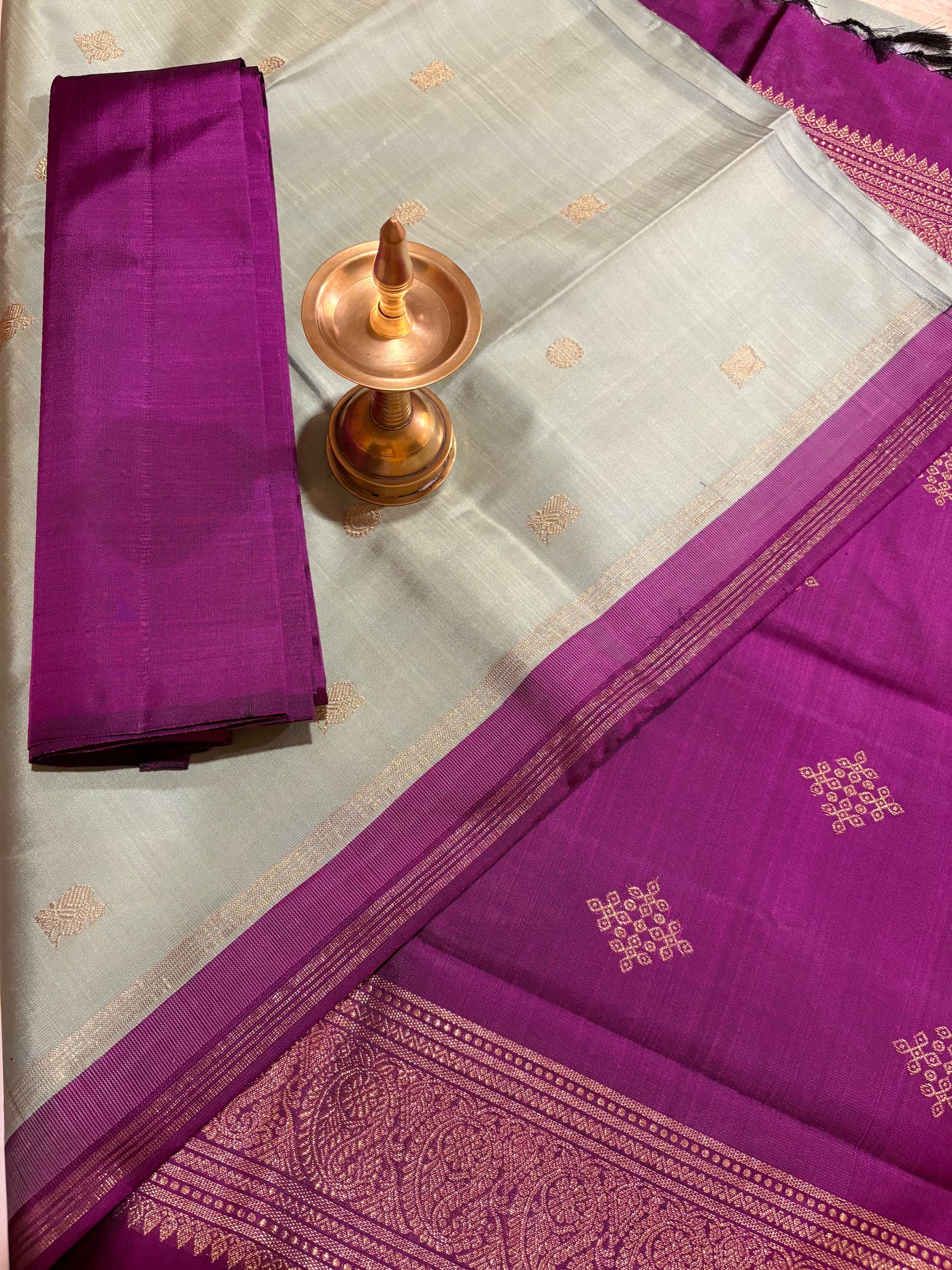 Pallu: The Deep Magenta pallu (Kanchana by Rani Pink) features two bands of border-inspired design sets with Kolam buttas at the centre, all intricately woven in Pure Zari. The rich contrast and detailed craftsmanship lend a classic, heritage finish.