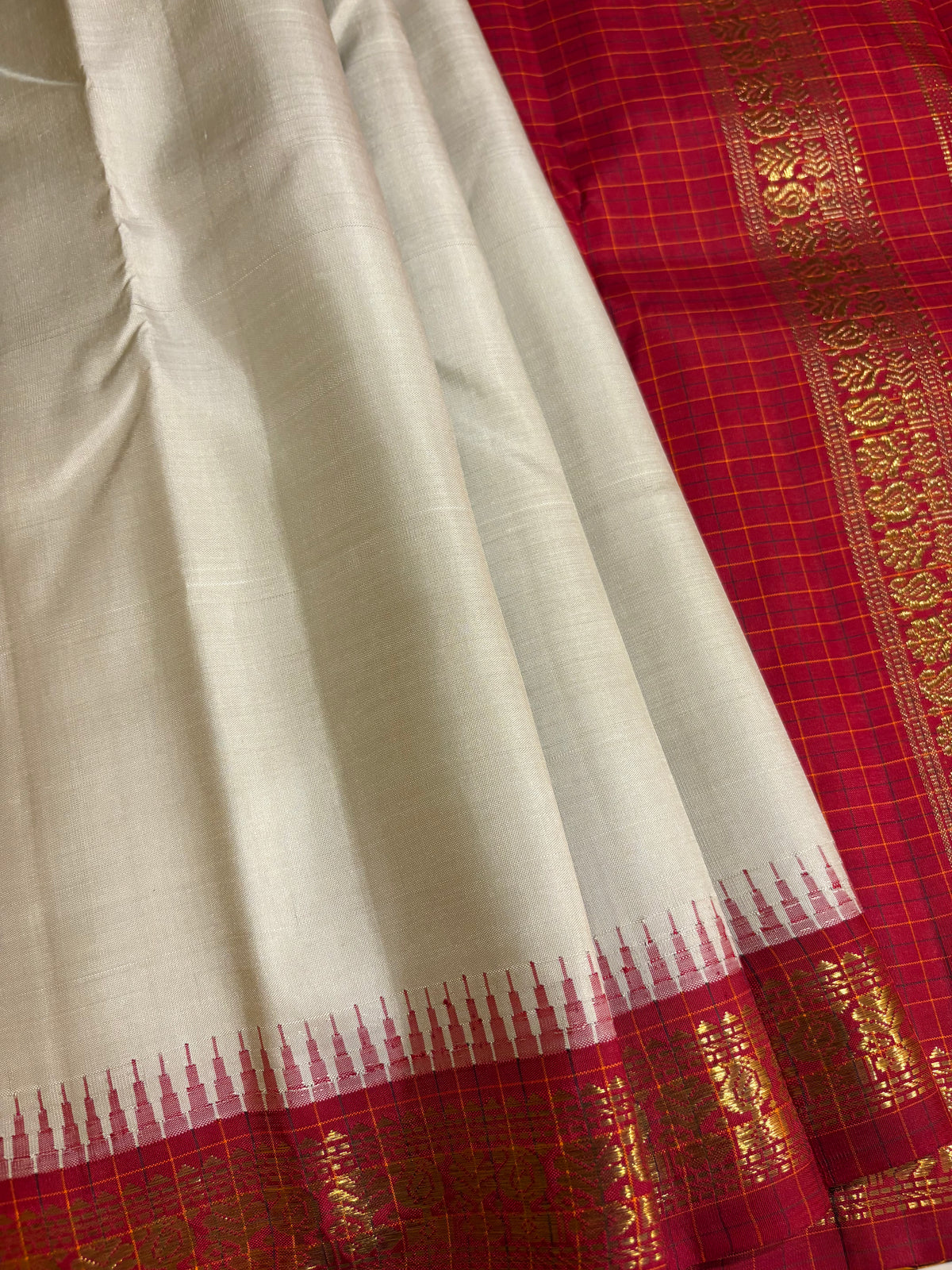 Saree Body - A pure, smooth Cream body provides a sophisticated canvas. The border and body are joined using the traditional KORVAI interlocking weave, which includes the rare TUPAKI Reku (a small, fine wave pattern often seen in vintage pieces).