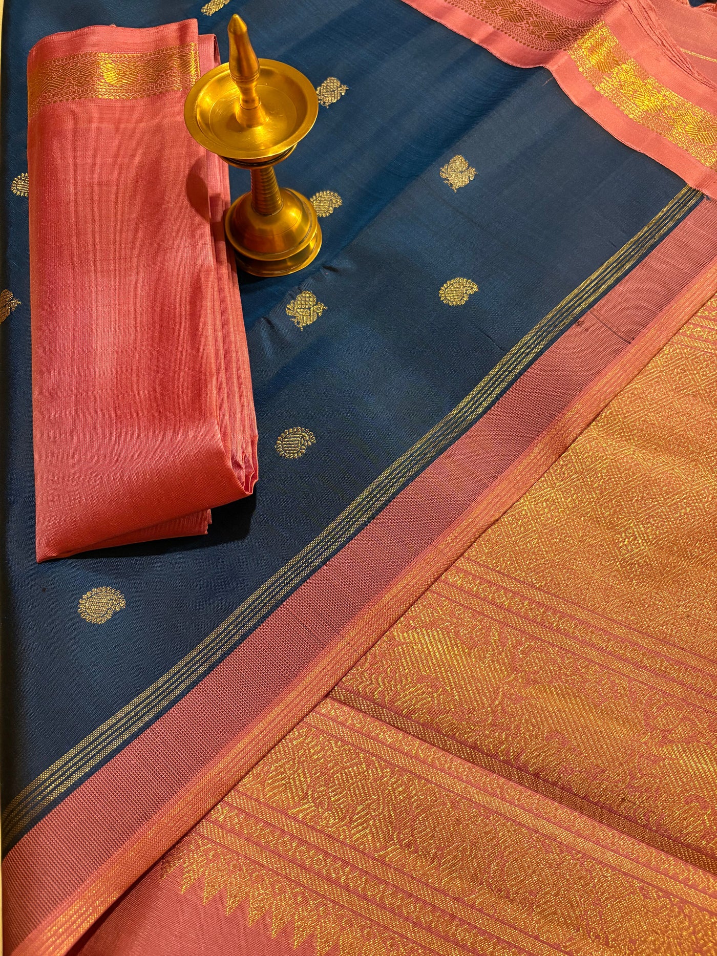 A stunning interplay of dark Neelam blue and lotus pink, this saree features Mayil Chakram buttas in Pure Zari. The one-inch Korvai border in lotus pink is adorned with Mayil and Manga Kodi motifs. The richly woven pallu in lotus pink exudes elegance, making this a perfect festive pick. Comes with a matching blouse.