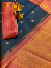 Dark Blue Korvai Kanjivaram Silk Saree with Lotus Pink Border - RK0402