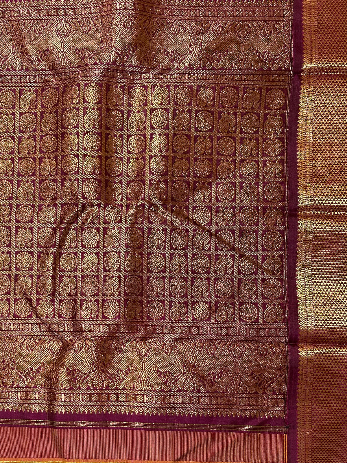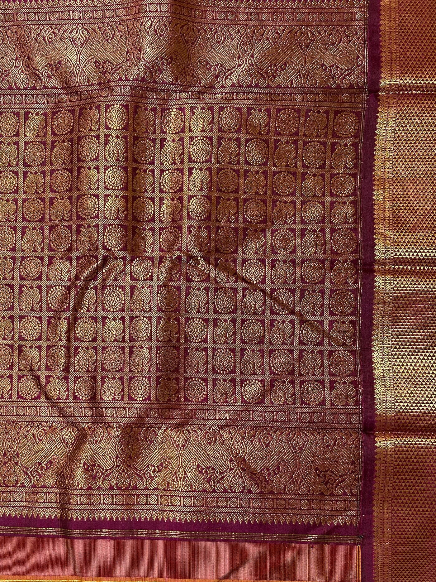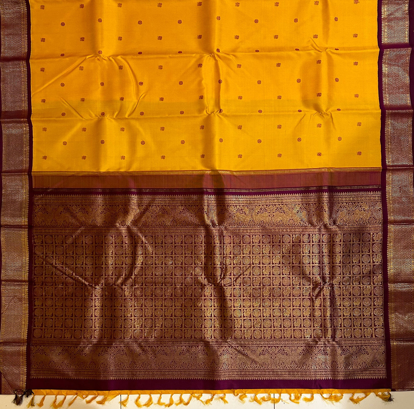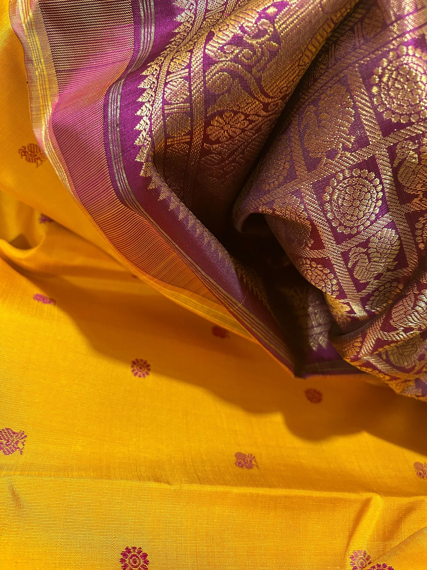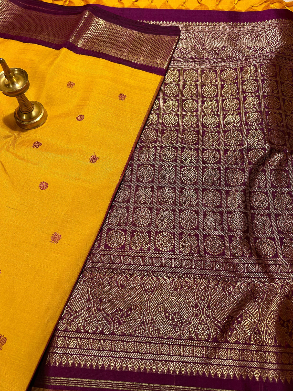 A mustard saree adorned with deep magenta pattu buttas and a Korvai border with Aarai Maadam zari design. The pallu is richly woven with pure zari, featuring Mayil Chakram buttas in the center. A matching blouse is included, making it a standout choice for traditional celebrations.