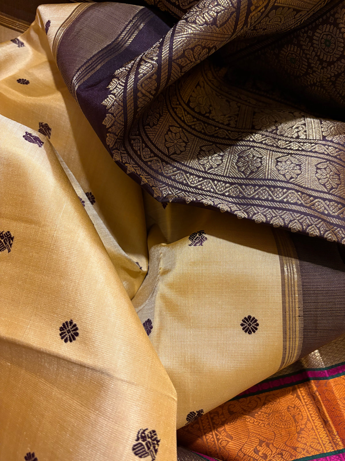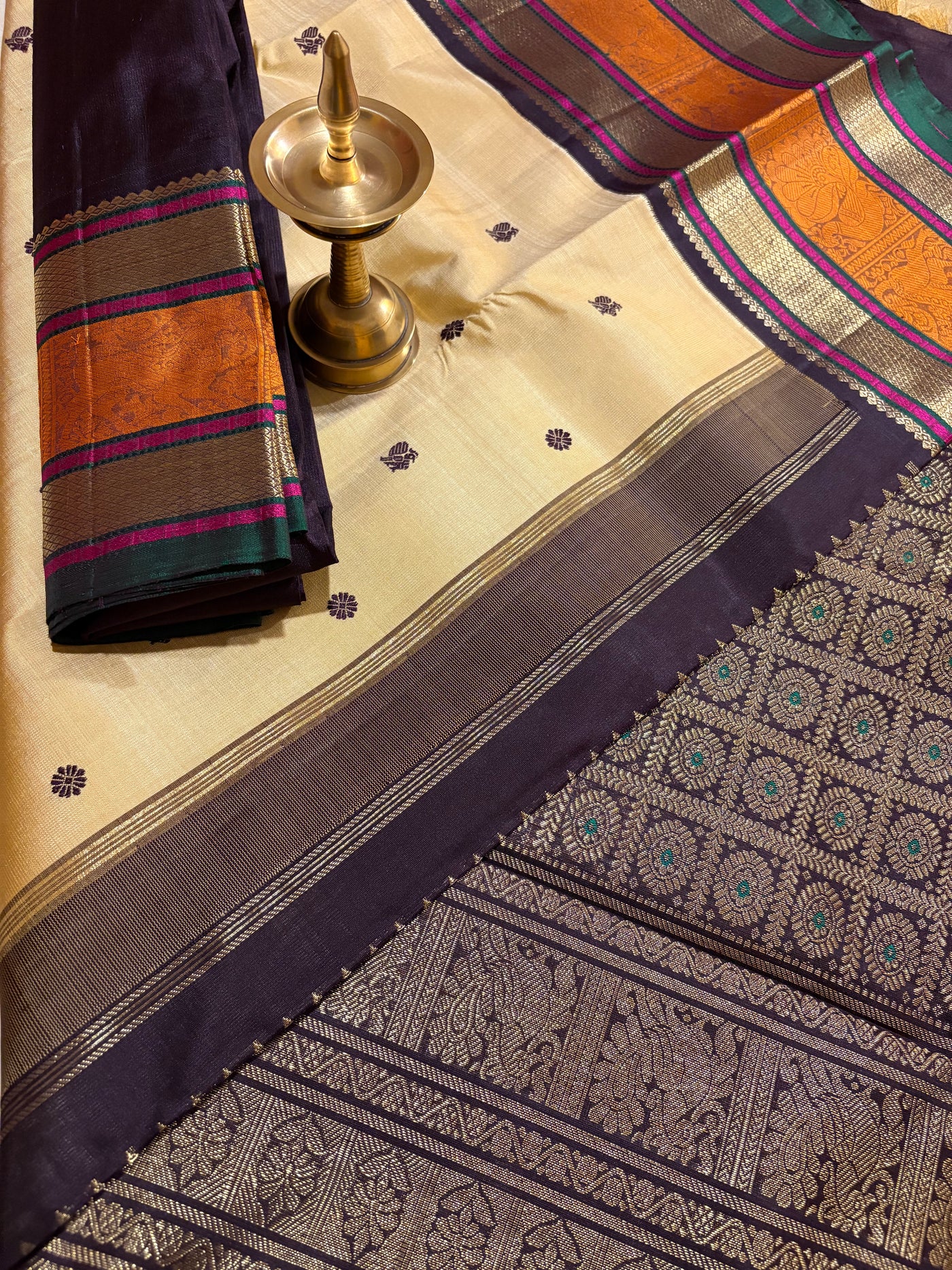 The saree features a graceful Light Beige (Dark Beige by Cream) body, adorned with Dark Brown Pattu Buttas, lending the drape a subtle yet classic richness. The Kai Korvai join enhances the handcrafted purity of the weave.