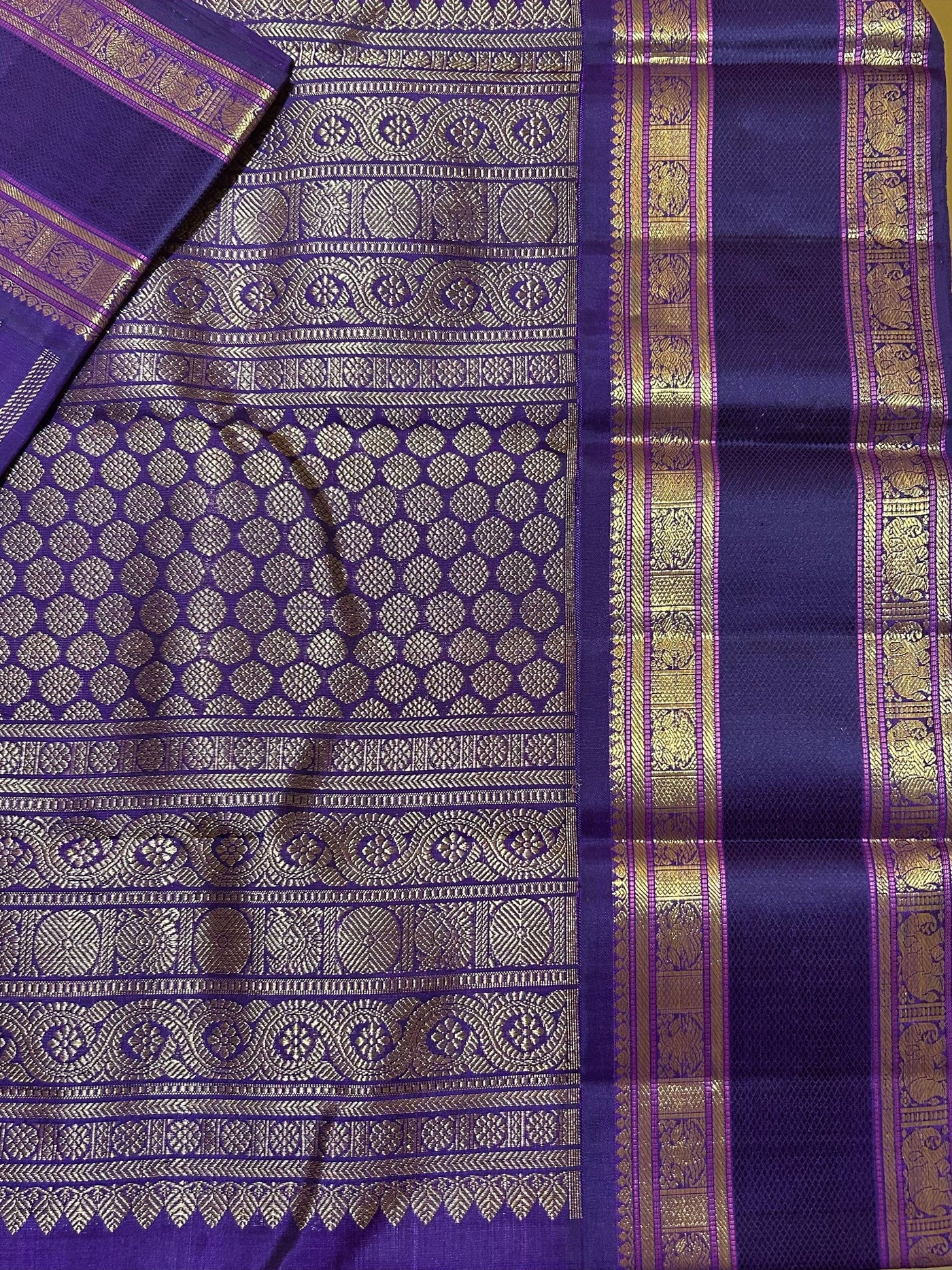 A luxurious custard cream Kanjivaram saree with diamond-shaped buttas in Meenakari zari work. The navy blue Retta Pett border features Yanai Pett motifs, and the densely woven pallu includes detailed zari patterns. This saree is a sophisticated choice, complete with an attached blouse.