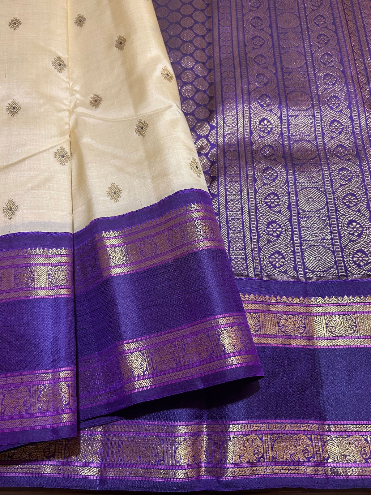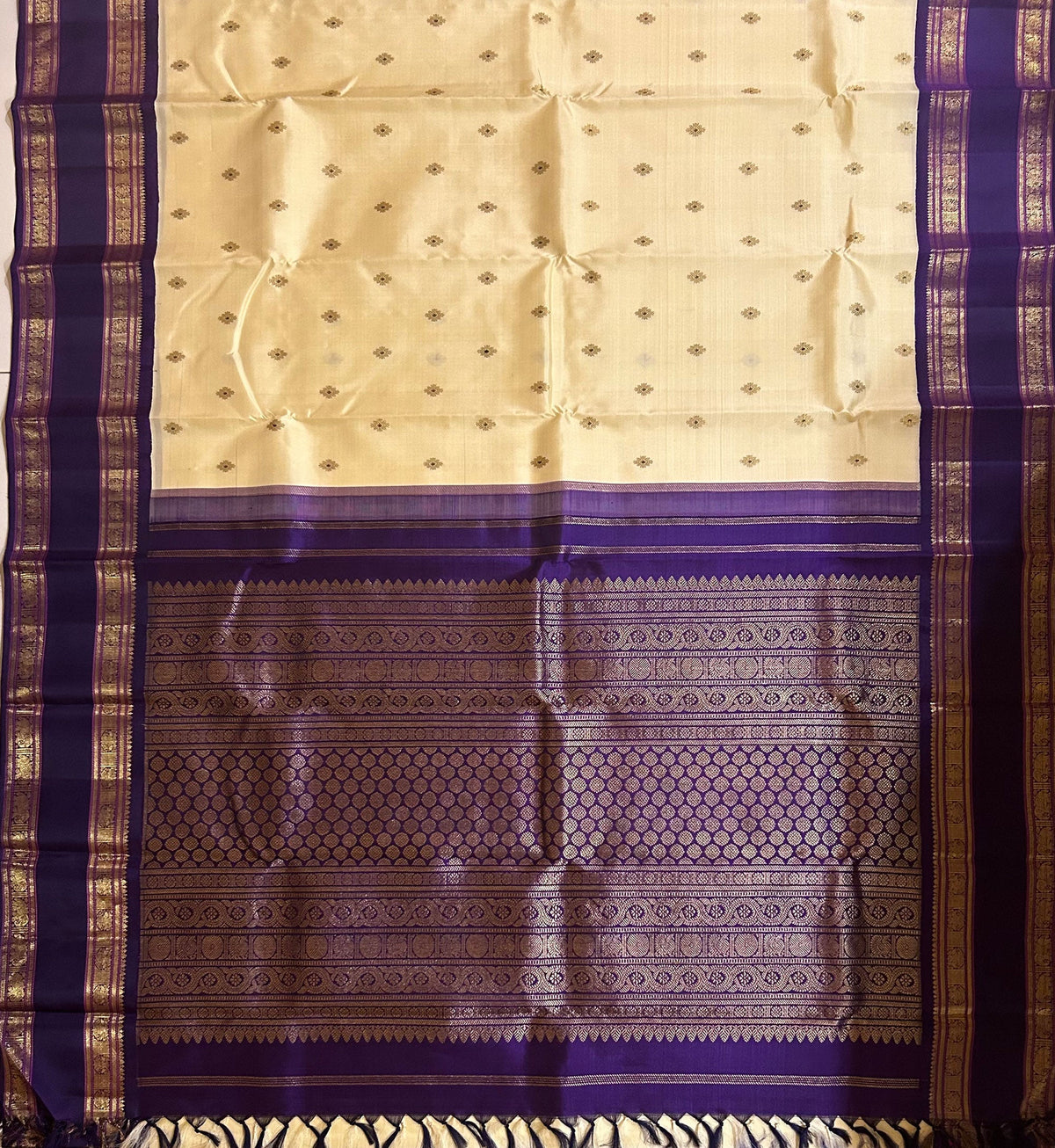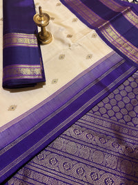 Custard Cream Kanjivaram Silk Saree with Navy Blue Retta Pett - RK096
