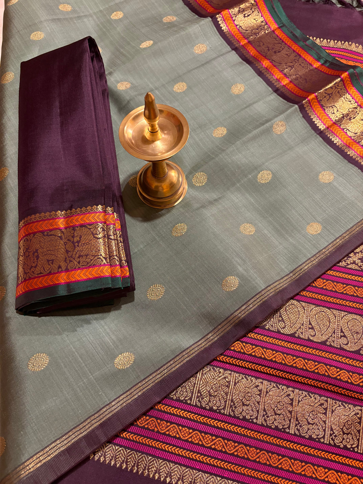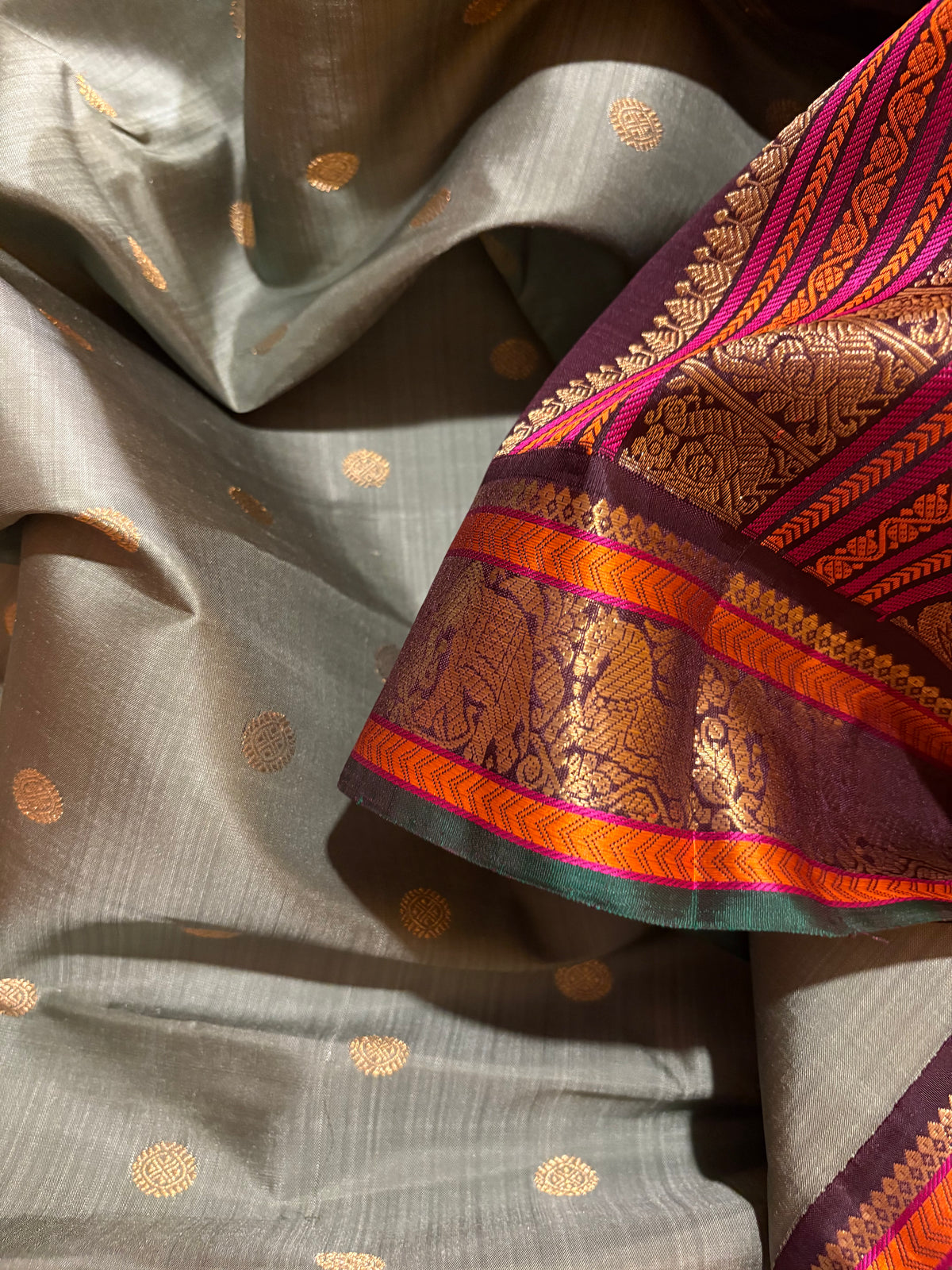We sell authentic pure silk and pure Zari Kanjivaram sarees. The Silk is pure Mulberry silk and the Zari is pure. All our sarees are adorned with pure Zari.