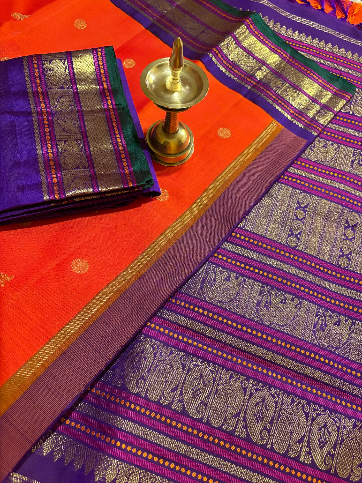Orange Korvai Kanjivaram Silk Saree with Deep Purple Border RK0531