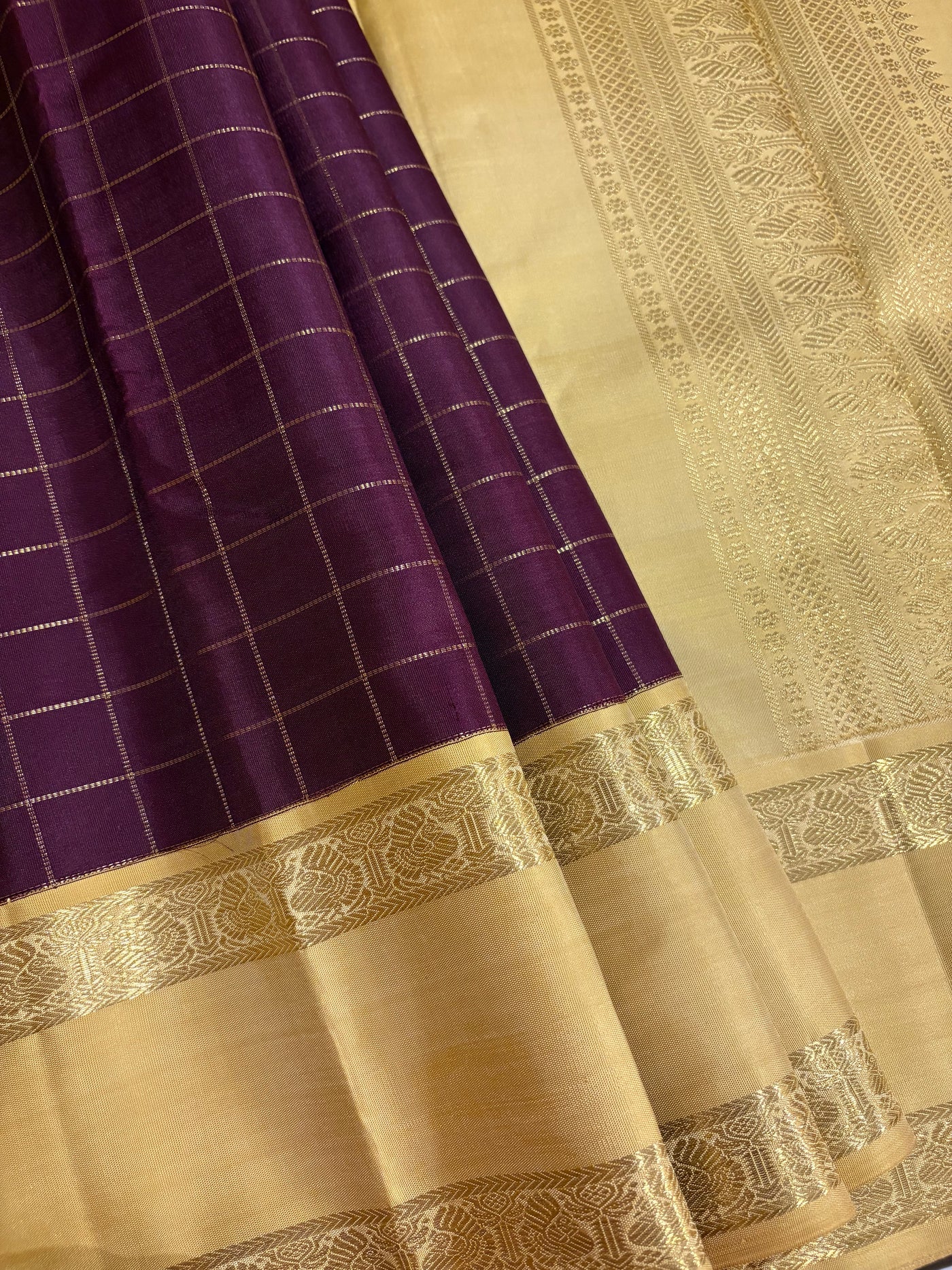 A rich and earthy V Paaku (Betel Nut) toned body, beautifully woven with Pure Zari Kattam (checks) that gives the saree a gentle, understated shimmer. The colour exudes traditional warmth with a graceful vintage charm.