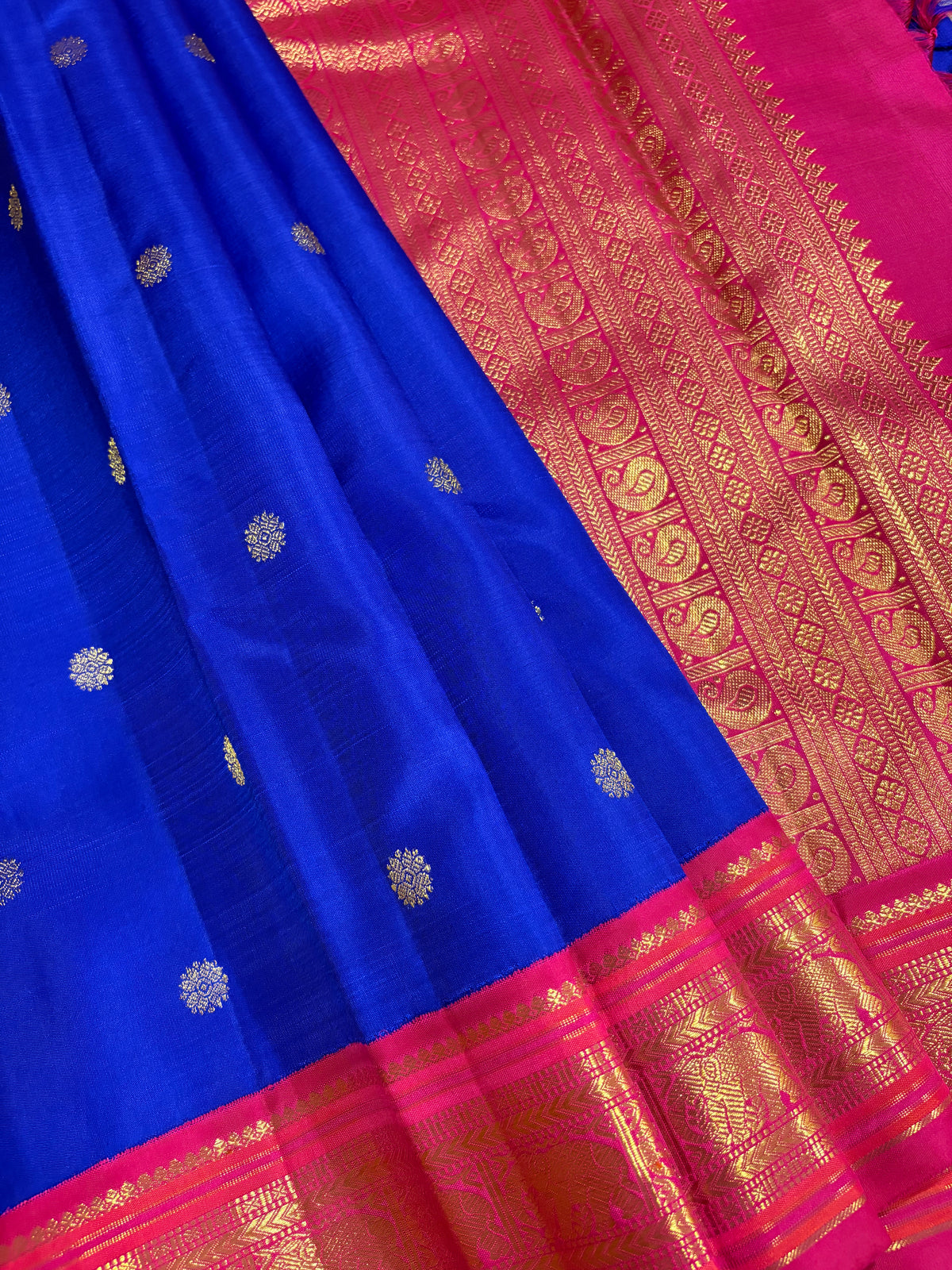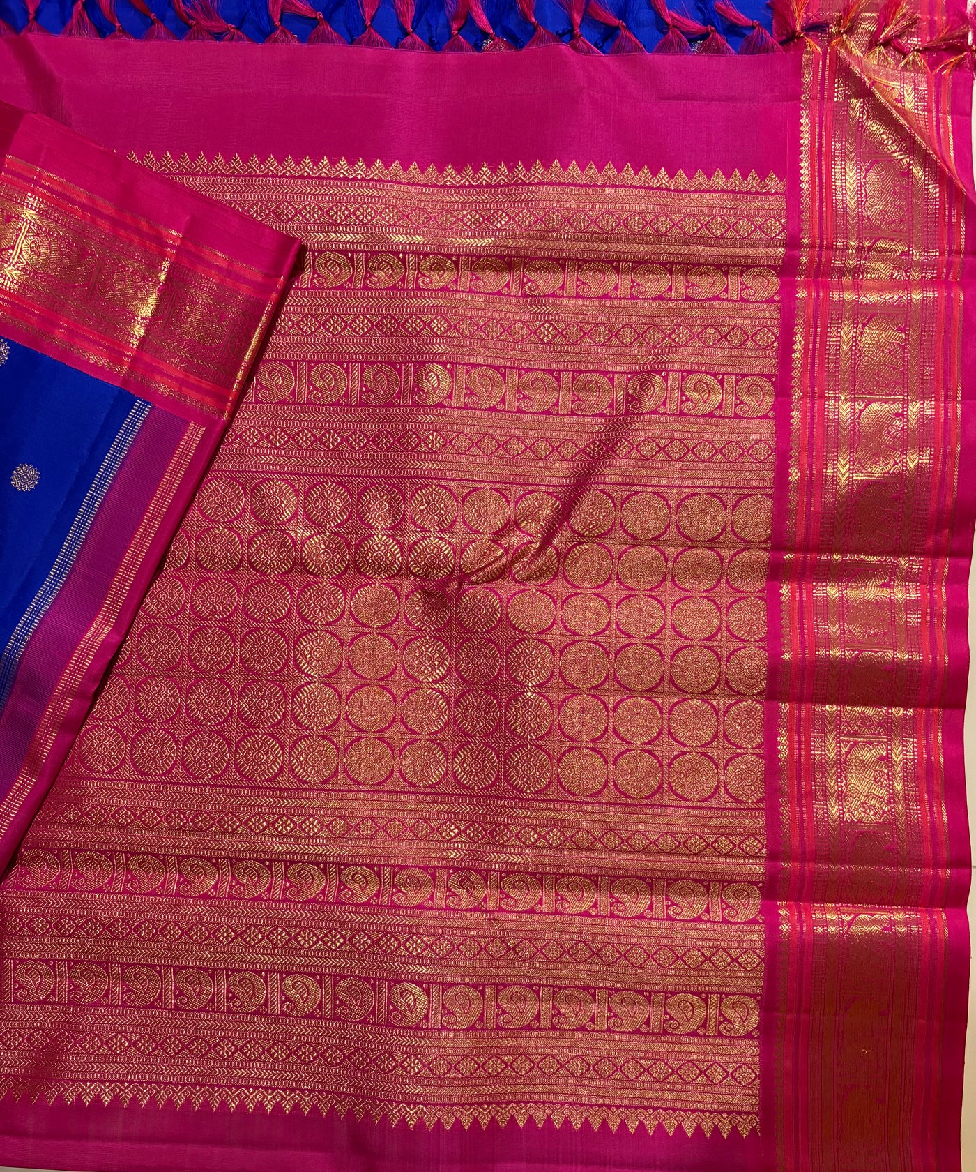 A regal Royal Blue body, beautifully adorned with intricate Chakram buttas woven in Pure Zari. The motifs add a graceful sheen and elevate the saree with a rich, traditional character.