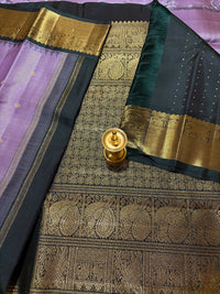 This lavender Kanjivaram saree is adorned with muthu vaira oosi and chakram buttas in pure zari. The dark green border features yanai and mayil pett designs with pillayar reku details, while the densely woven zari pallu enhances its richness. Comes with a matching blouse, perfect for weddings and festive events.