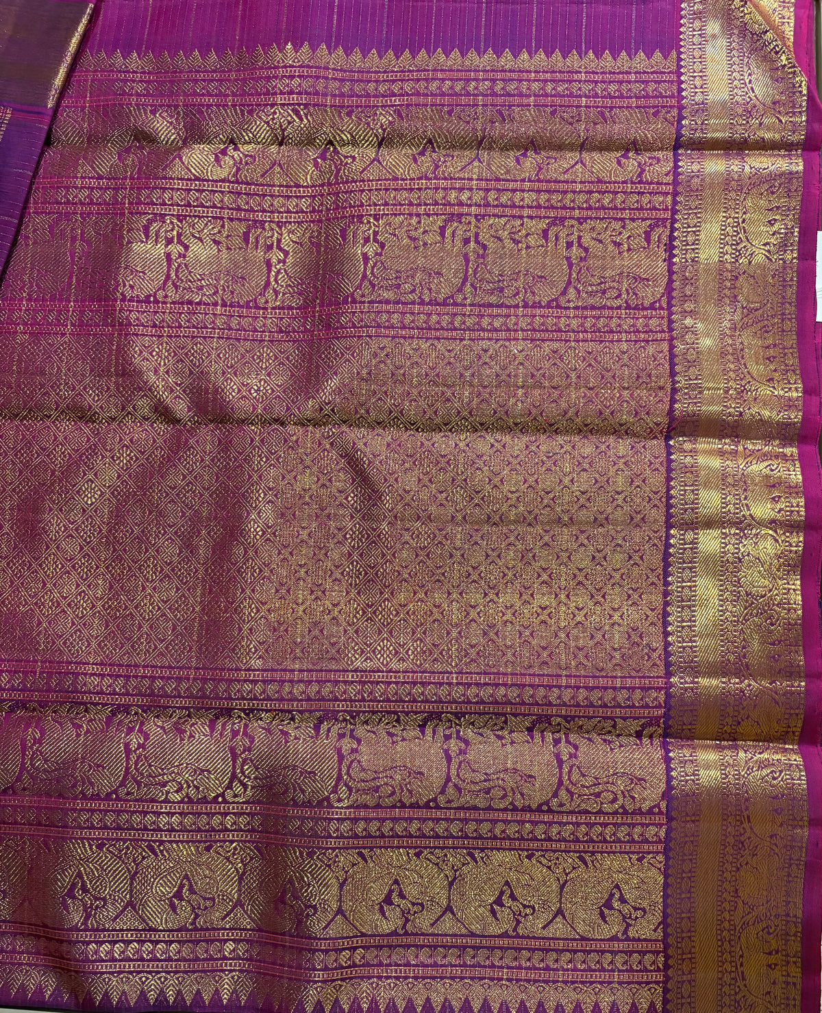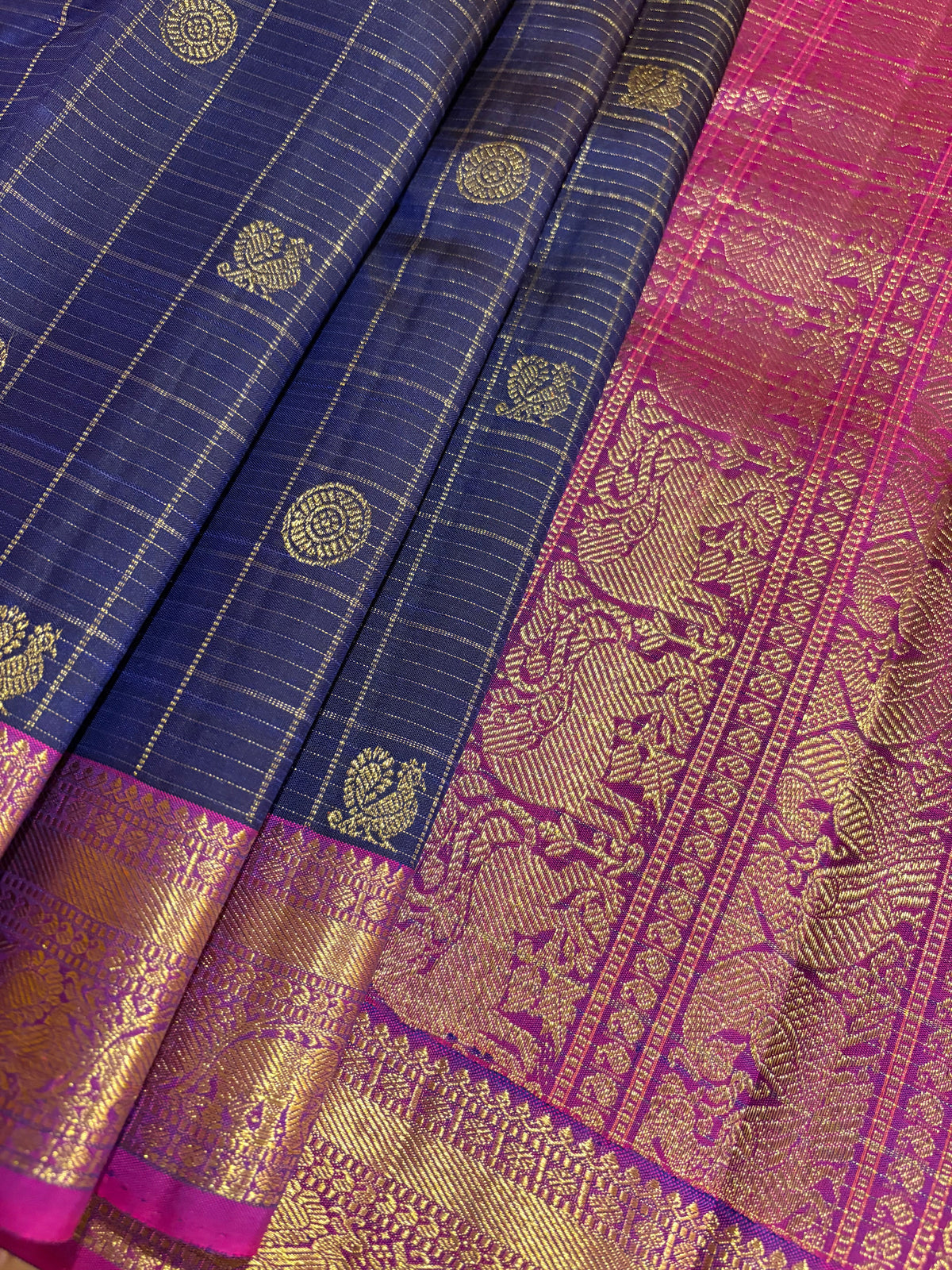 This kanjivaram silk saree features a navy blue base with chess kattam (checkered) patterns and vaira oosi (thin zari lines). The design gives it a structured and regal look. The silk’s soft texture and sheen make it a great choice for weddings and functions.