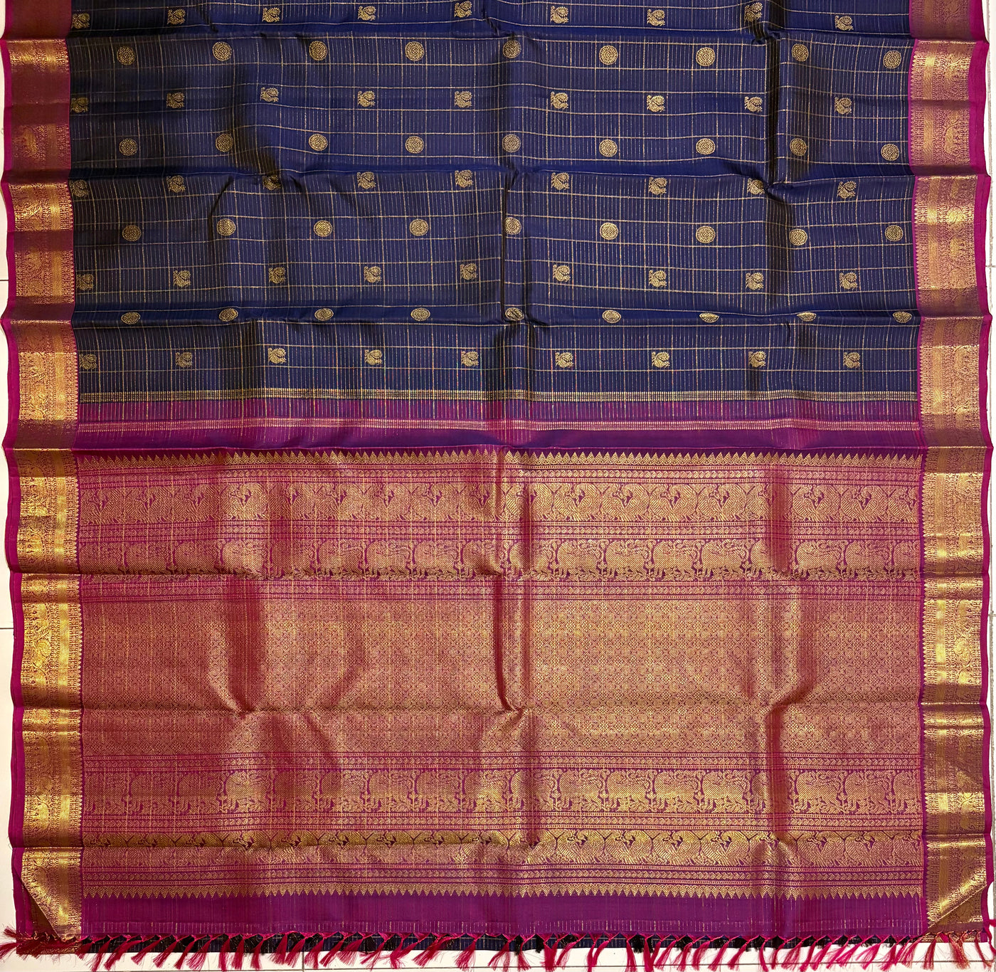 Navy Blue Chess Kattam Kanjivaram Silk Saree with Vaira Oosi - RK0189