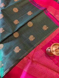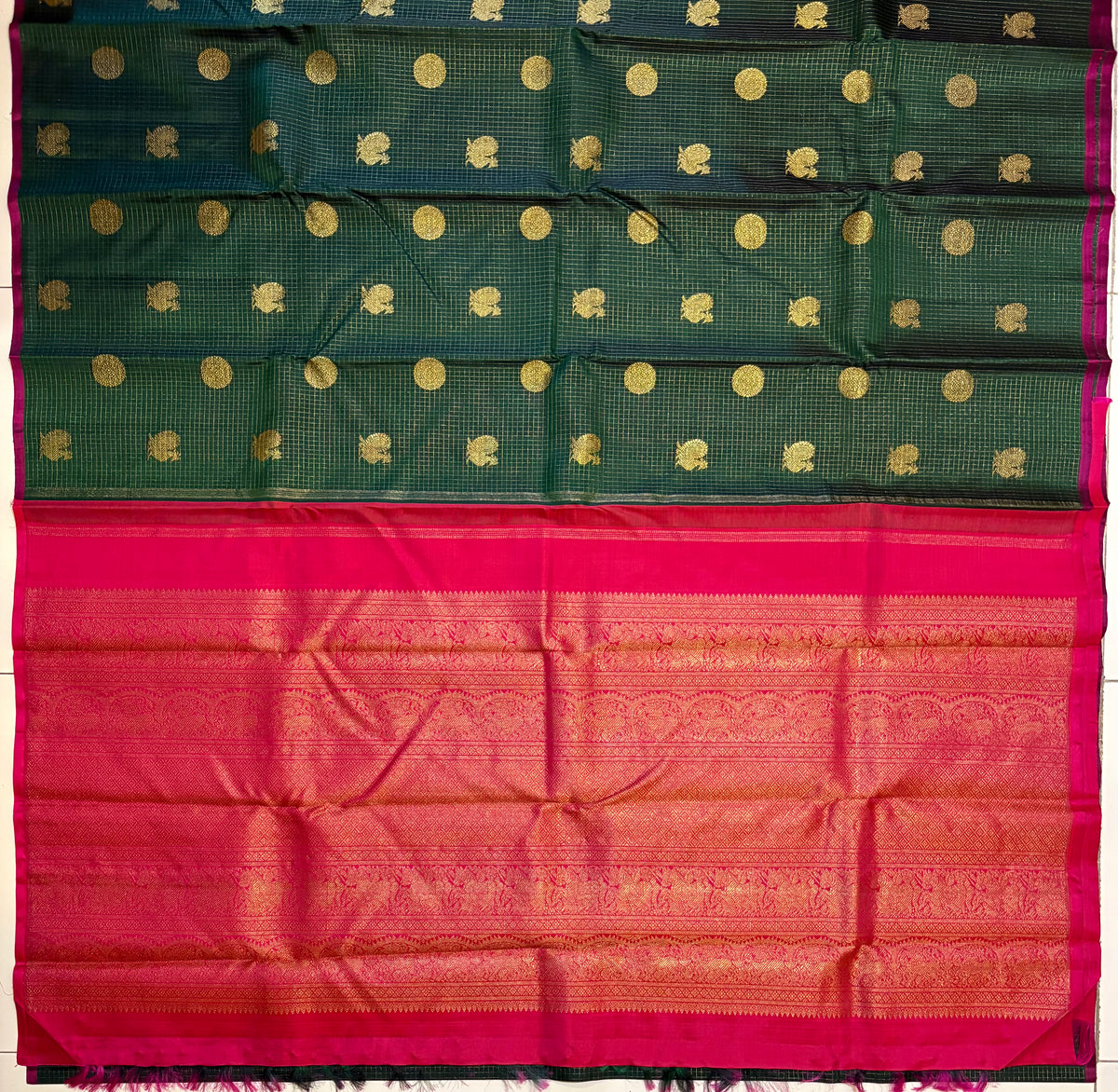 The body of the saree is Karum Pachchai with delicate zari kattam, adorned with Mayil Chakram buttas in pure Zari. The borderless saree has a beautiful Rani pink selvedge. Pallu is Bright Rani pink, rich and densely woven with pure zari. Blouse attached.
