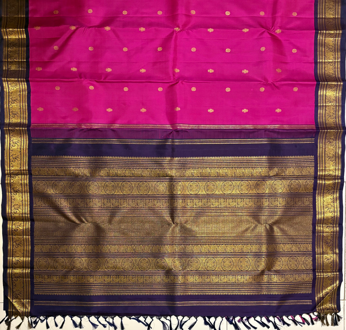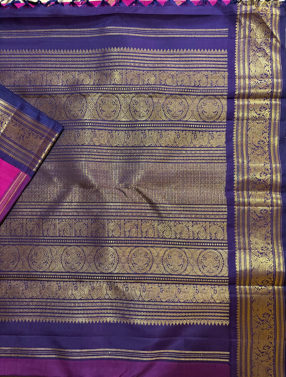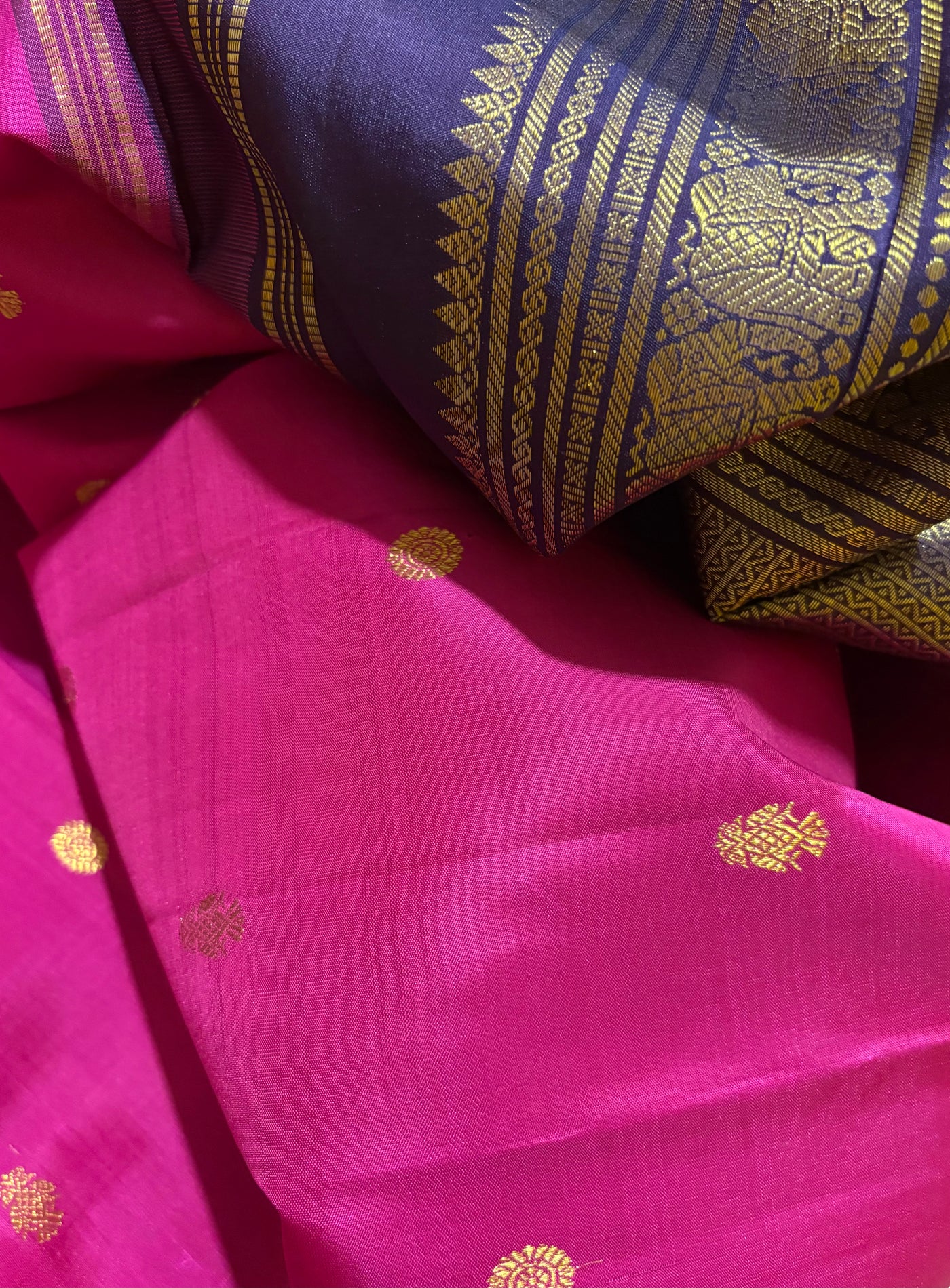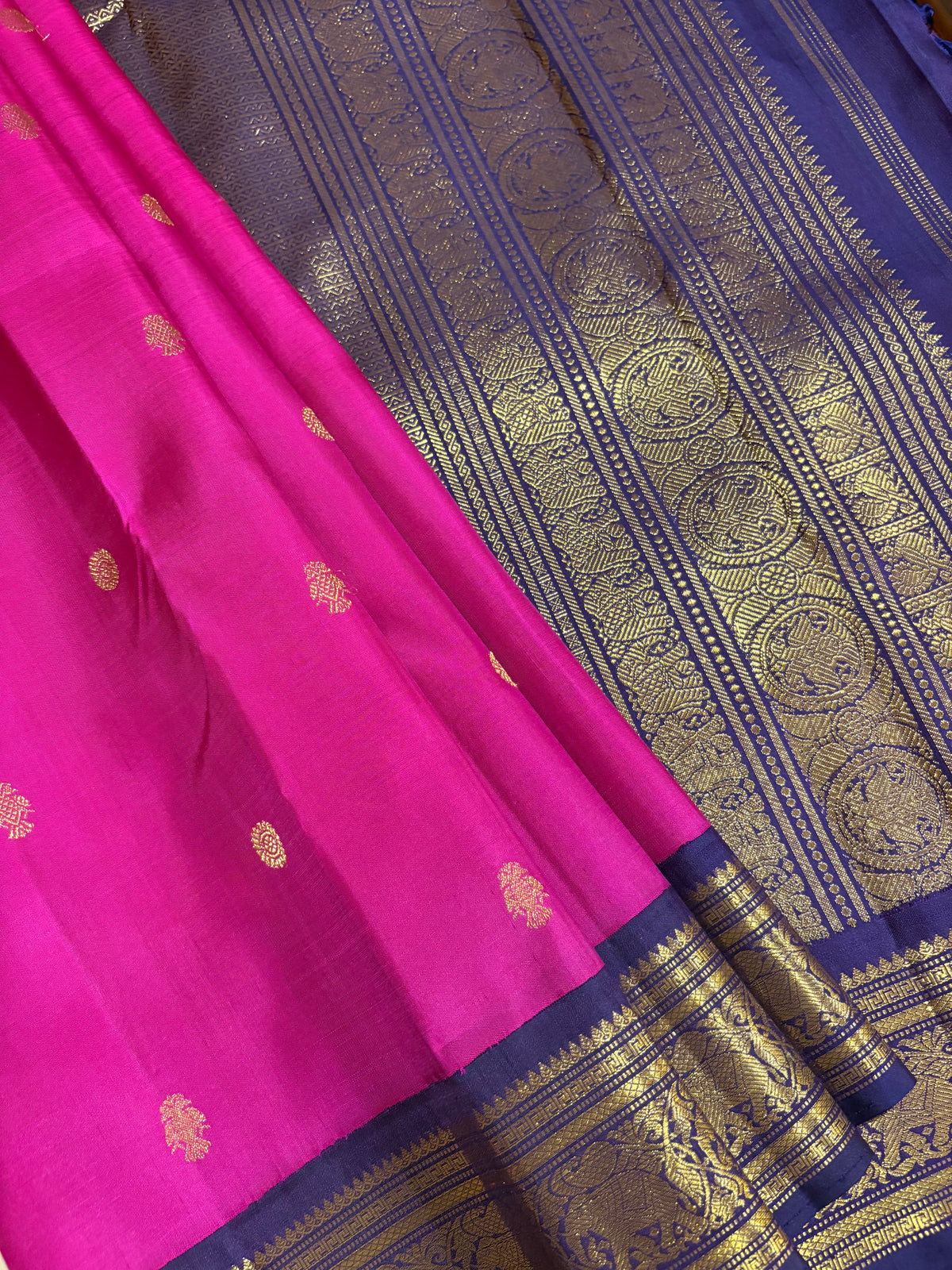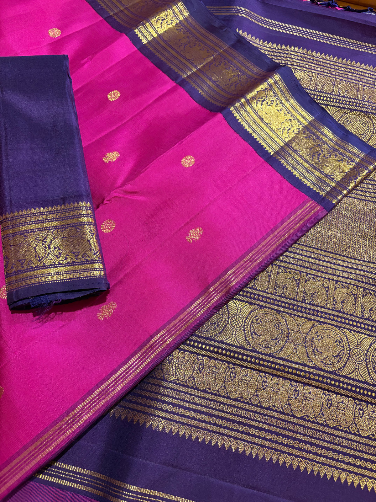 This Vintage pink Korvai Kanjivaram has Zari buttas. The border is Navy blue, adorned with elephant pett in zari. Pallu is rich and densely woven with pure zari. Blouse attached.